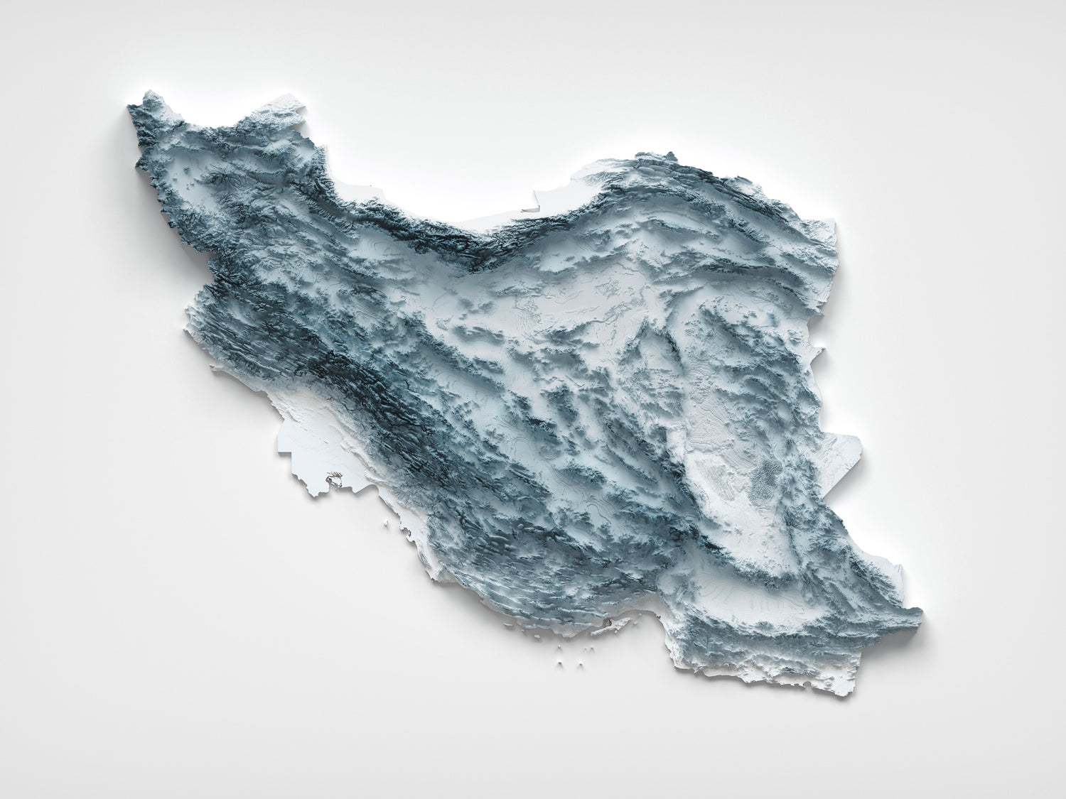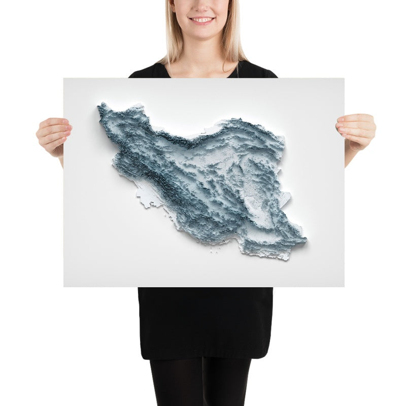 This is a minimalist topographical relief map of Iran, created by The Unique Maps Co. and enhanced with our trademarked Unique 3D process. There are no labels, no roads, and no towns — just the country’s contours, sculpted so that light and shadow pick out high peaks, low valleys, and the sweeping basins that define the Iranian Plateau. It invites you to trace the story of Iran’s landforms with your eyes, following the ridgelines where they gleam and the valleys where shadows settle.