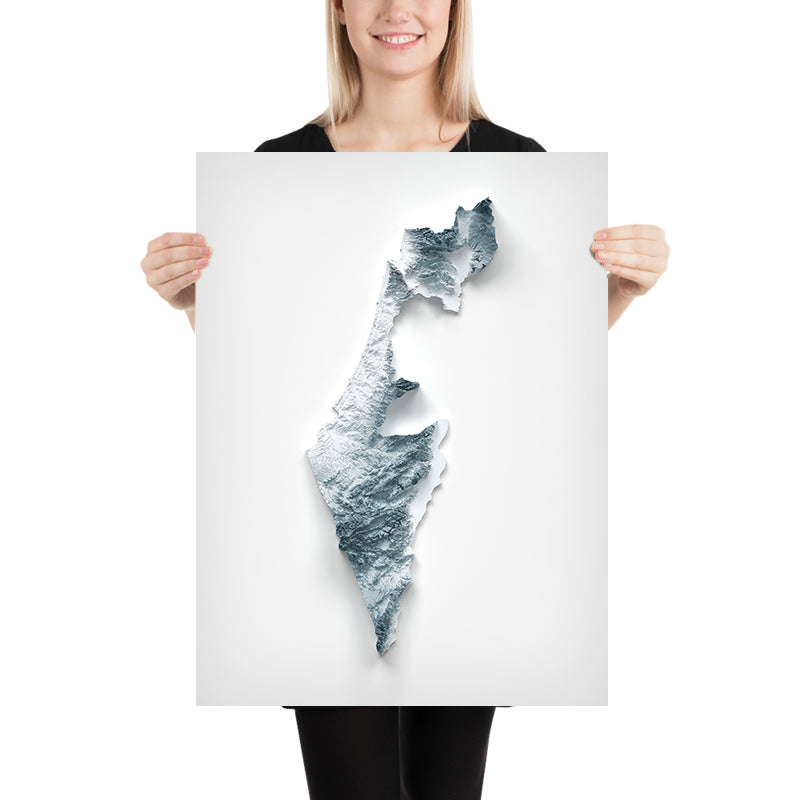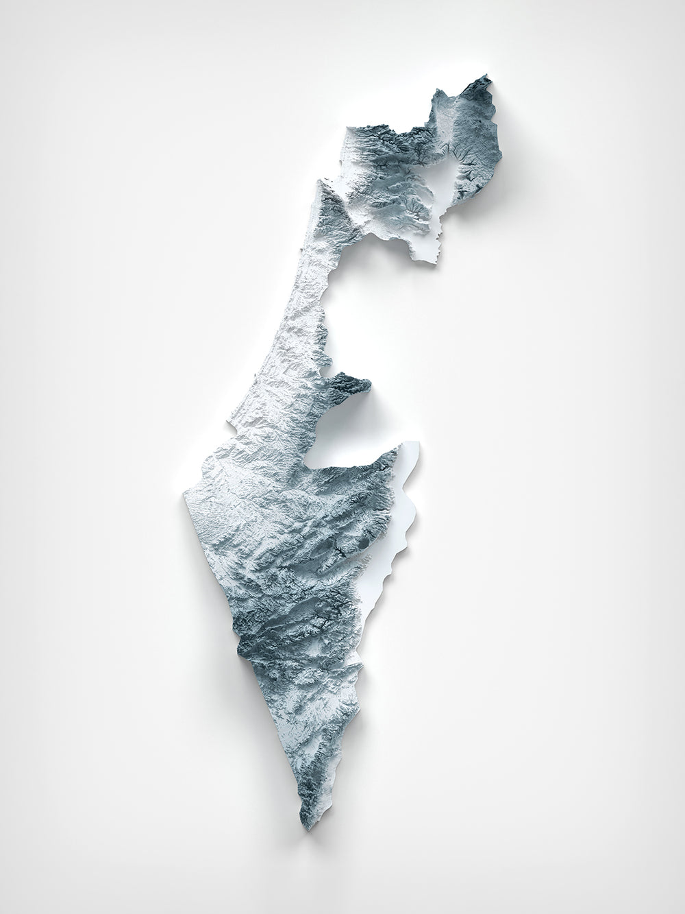 This is a minimalist topographical relief map of Israel, created by The Unique Maps Co. and enhanced with our trademarked Unique 3D process. There are no labels, roads, or towns—just the sculpted land itself. Gentle highlights skim the crests while shadows settle into the hollows, making peaks, escarpments, basins, and wadis read clearly at a glance.