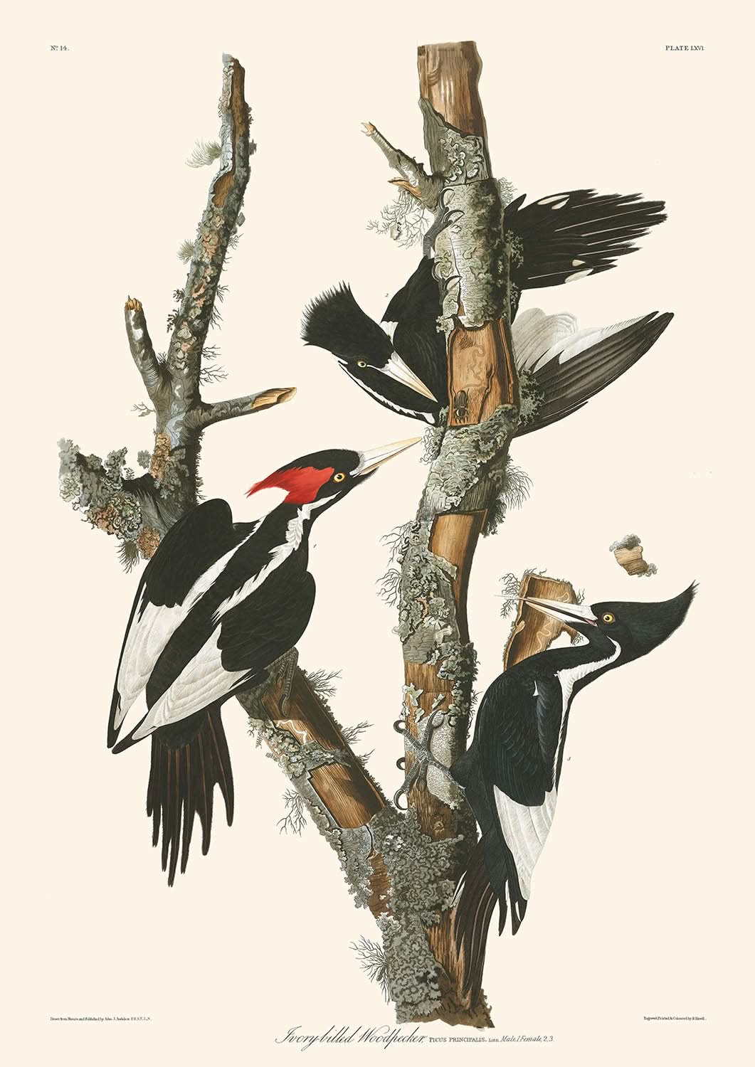 Ivory-billed Woodpecker (Plate 66) by John James Audubon, first published in 1827, is one of the most striking bird illustrations from the eminent series The Birds of America. Audubon, renowned for his profound love of avifauna, captures the majestic elegance of the Ivory-billed Woodpecker with an accuracy and vibrancy that truly brings the subject to life.