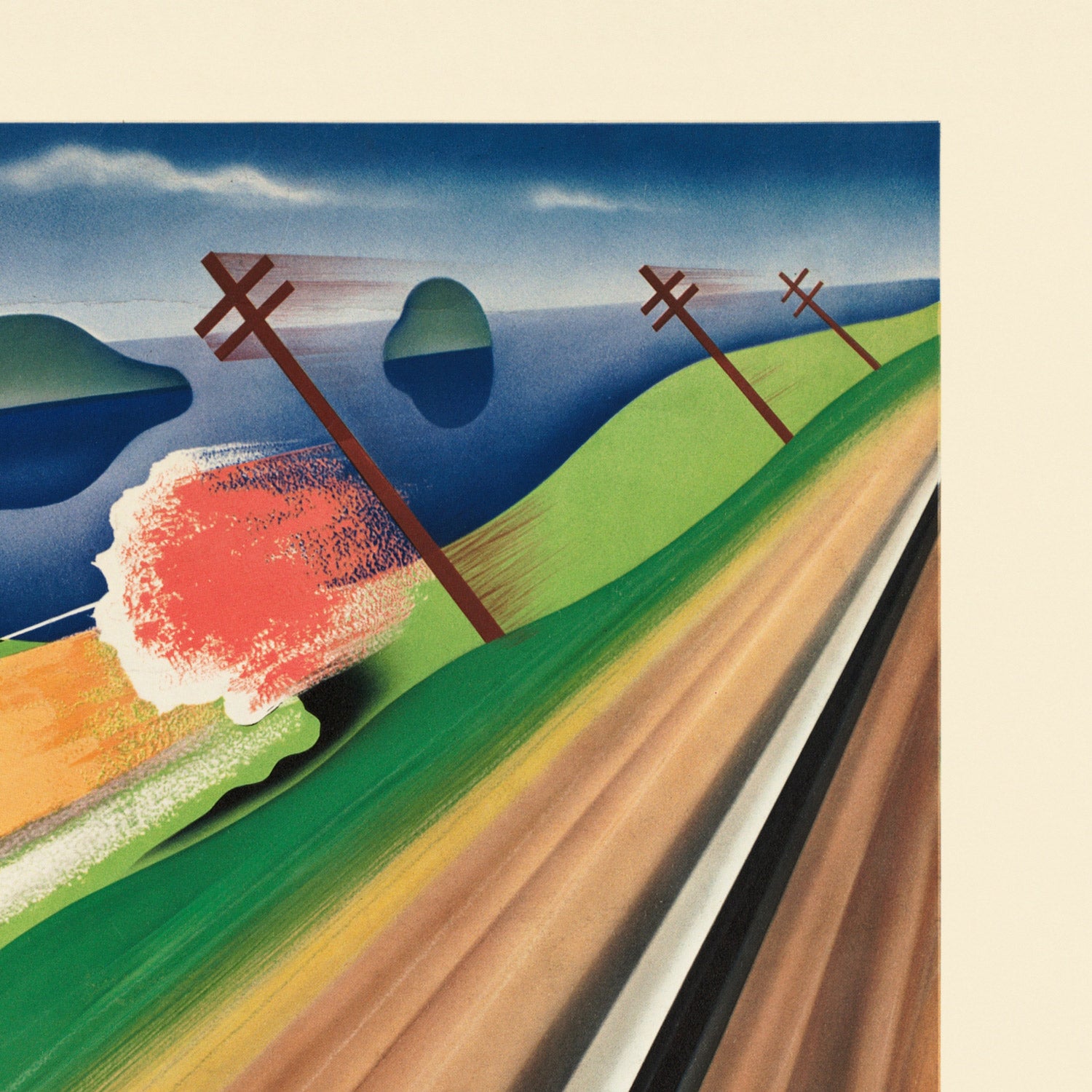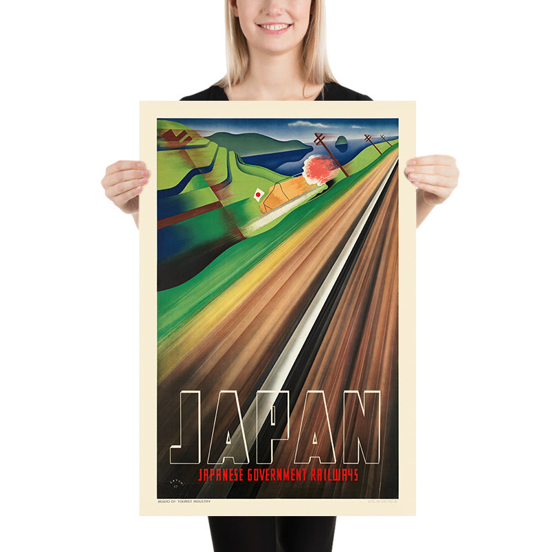 About the subject: This poster focuses on the exhilaration of rail travel across Japan’s varied landscapes, a powerful symbol of modernization at the time. Parallel tracks rush toward a bright horizon, an elegant shorthand for progress and connectivity, while a subtle Japanese flag element adds a note of cultural pride. The crisp, sans-serif “JAPAN” lends instant legibility and a cosmopolitan polish—just the sort of typography that defined interwar travel advertising across the globe.