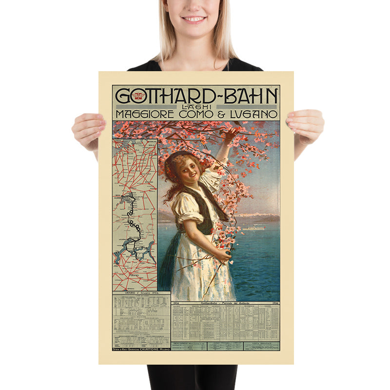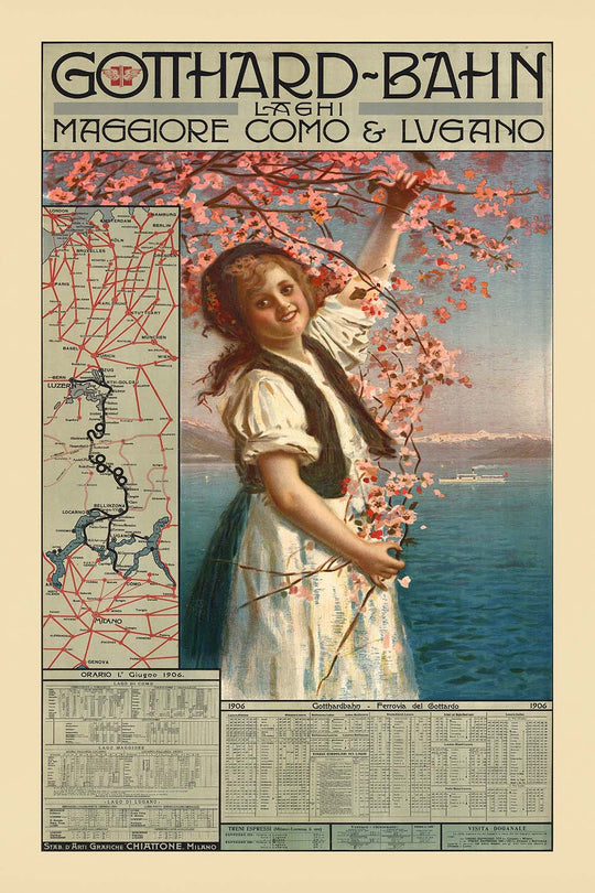 Gotthard-Bahn, Laghi Maggiore, Como e Lugano by Gabriele Chiattone (1906) captures the romance of cross-border travel between Switzerland and northern Italy at the height of the Belle Époque. Commissioned for the Gotthard Railway, the poster sets a smiling young traveler in a white dress beneath an arch of pink blossom, the bough sweeping across a pastel sky as a white steamer slips over deep blue water and violet mountains fade into the distance. At left, a precise route map and, below, neat timetables promise effortless connections to the great lakes of Maggiore, Como, and Lugano.