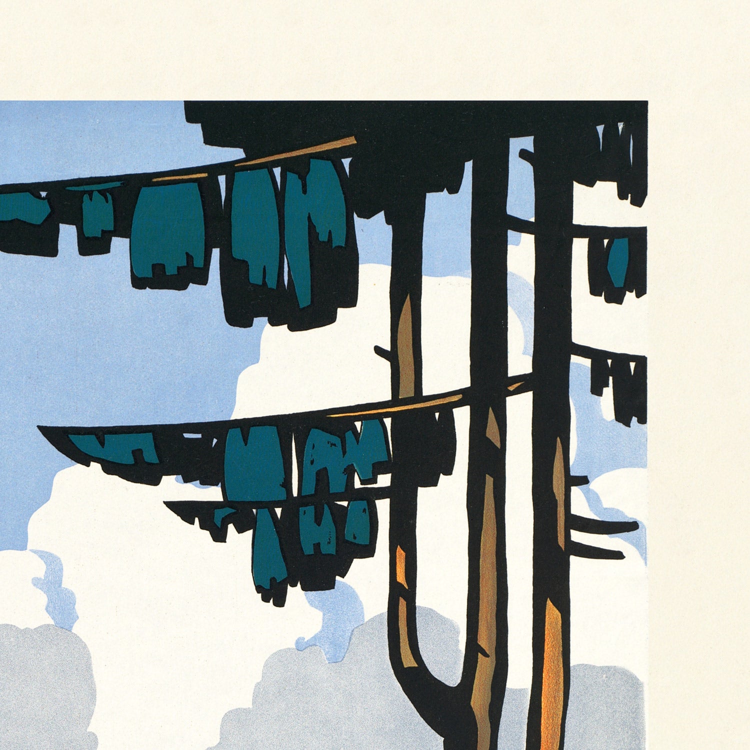 Austria is a classic vintage travel poster celebrating the romance of an alpine journey, created by an anonymous designer whose work channels the mid-century European poster tradition. Commissioned to entice travelers with a vision of fresh air and grand landscapes, the artwork captures the enduring allure of Austria’s mountains and lakes. In the image, a broad sweep of white negative space opens the scene while layered planes of blue and teal stack like distant ranges, settling into a deep, grounding band of forest tones below—an elegant nod to snow-bright peaks, clear skies, and crisp highland air.