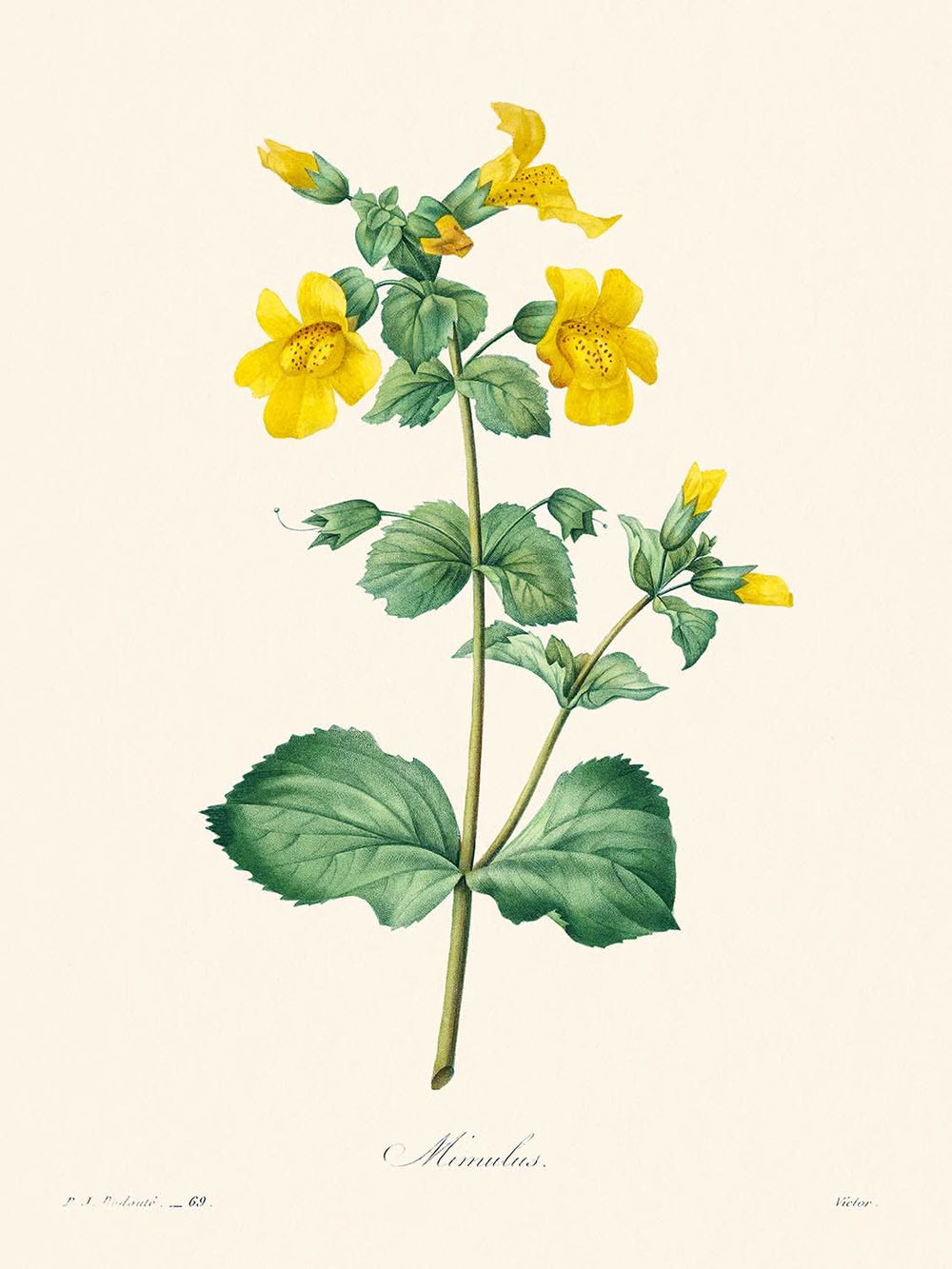 Mimulus, created in 1802 by the esteemed botanical artist Pierre-Joseph Redouté, is a breathtaking illustration that showcases Redouté's masterful ability to capture the delicate beauty of nature. Known as one of the greatest botanical illustrators, Redouté meticulously documented the flora around him with an unparalleled attention to detail and elegance.