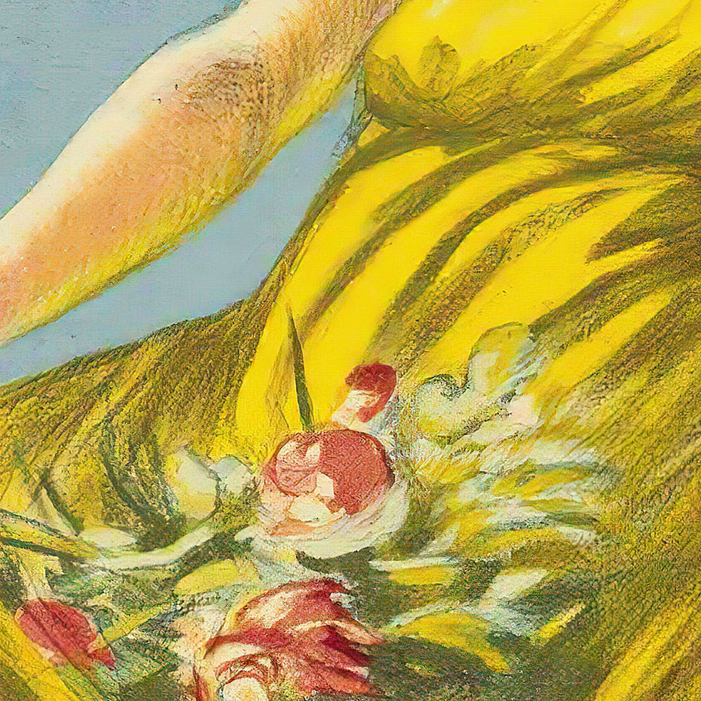 The 1920 Exposition of Monaco represented a spirited return to culture and travel in the post-war years, and Cappiello’s image channels that optimism. The heroine—an archetype of modern beauty—moves with buoyant grace, her armful of flowers symbolising growth, renewal, and the sensory pleasures of the Riviera. Behind her, the tranquil sea and terraced landscape evoke the principality’s singular geography, a meeting of cliff and harbour that became synonymous with refined leisure, concerts, gardens, and seaside promenades.