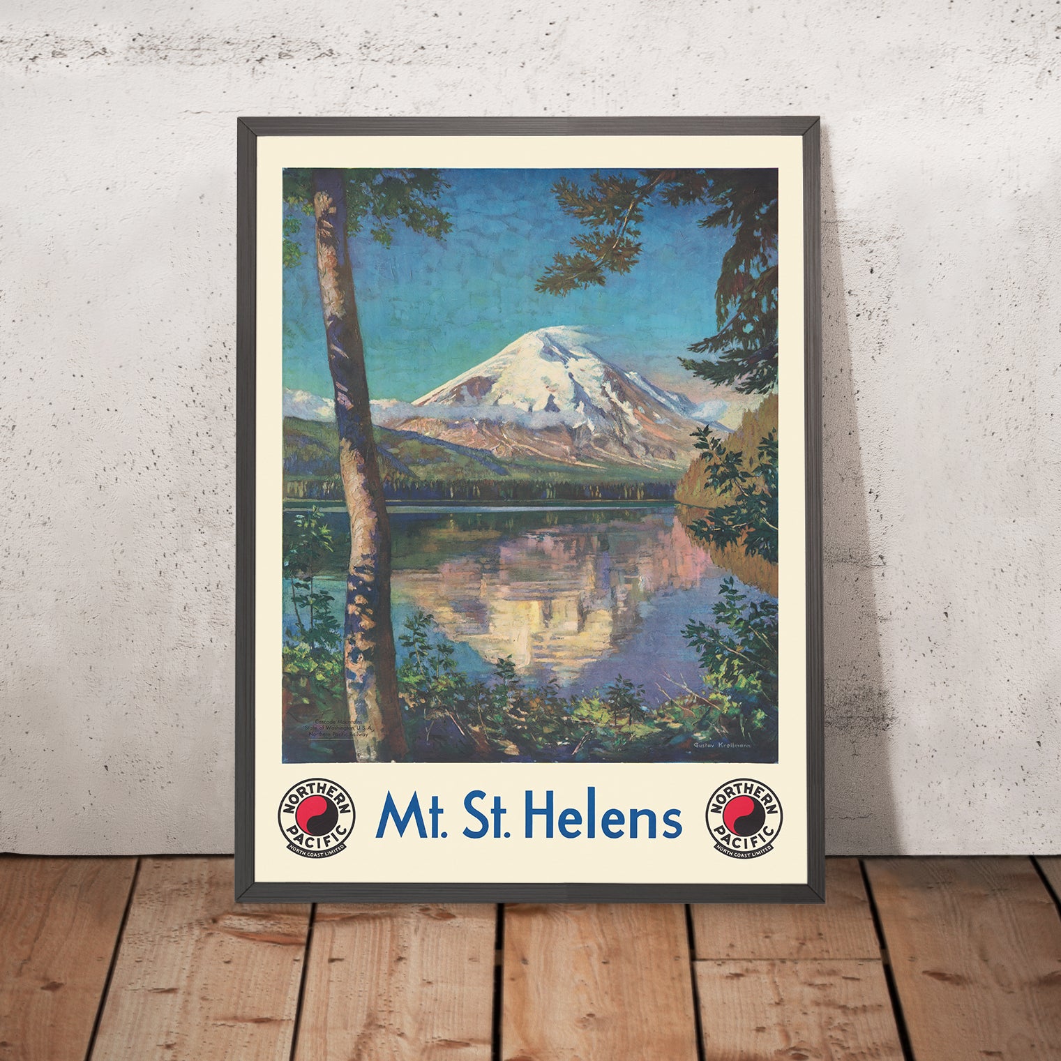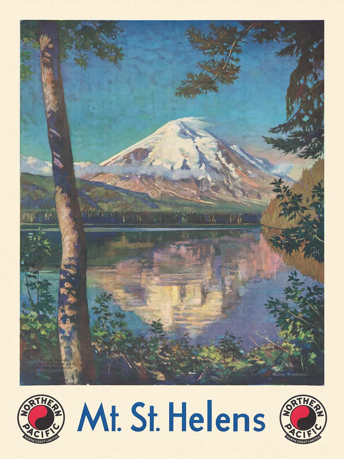 Mt. St. Helens Northern Pacific North Coast Limited by Gustav Wilhelm Krollmann, published in 1920, captures the Pacific Northwest at its most serene and inviting. A mirror-still lake leads the eye toward the snow-capped cone of Mount St. Helens, its white summit gleaming against a sky of layered blues, while ranks of evergreen trees frame the scene in rich greens. Created as a promotional travel poster for the Northern Pacific’s celebrated North Coast Limited, this design blends the clarity of early twentieth-century American poster art with the regional pride that would soon characterize American Regionalism—an affectionate, realistic attention to place that invites viewers into the landscape.