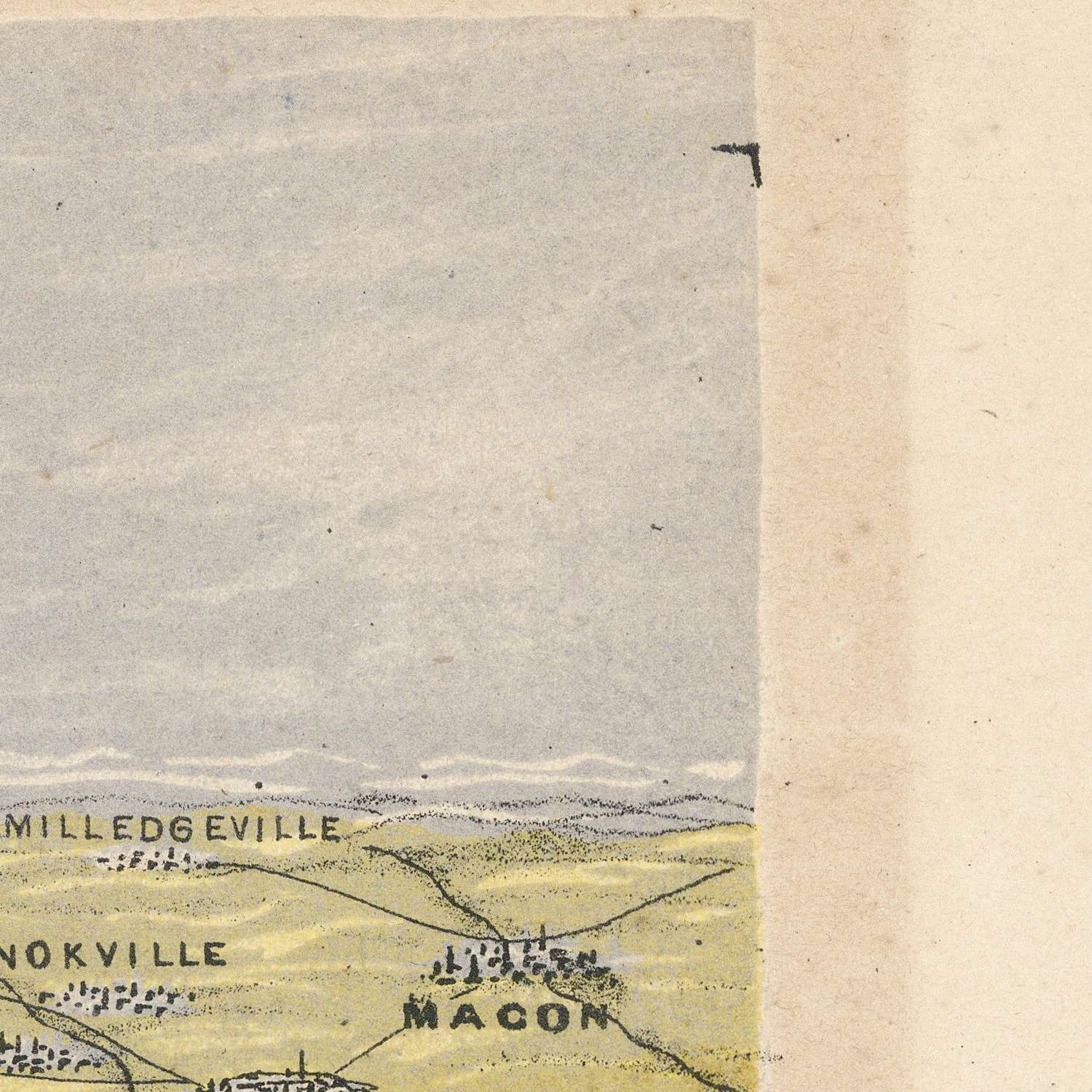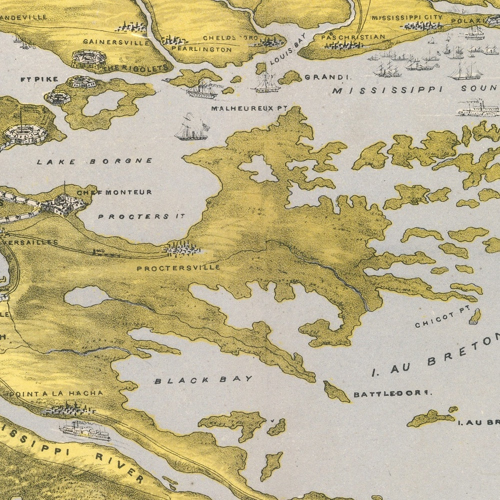 Inland, the web of rivers, bayous, and railways reveals the lifelines of war. The Mississippi, with its looping bends past East and West Baton Rouge to Vicksburg and Natchez, appears as the continent’s grand artery, while subsidiary waters—Bayou Lafourche, Lake Pontchartrain, and Lake Maurepas—trace alternative routes for stores and troops. Railroad lines are drawn with unusual clarity, tying Jackson to the upland South and linking Selma and Montgomery to coastal depots, a reminder that rails, as much as rivers, would determine movement and momentum. Vicksburg’s position atop commanding bluffs is suggested by the perspective itself, foreshadowing the city’s later ordeal. Read this sheet as a logistics map in disguise: it explains why bridges, ferries, depots, and junctions would attract campaigns as surely as capitals, and why the Delta’s labyrinth made mastery of the coast only half the battle.