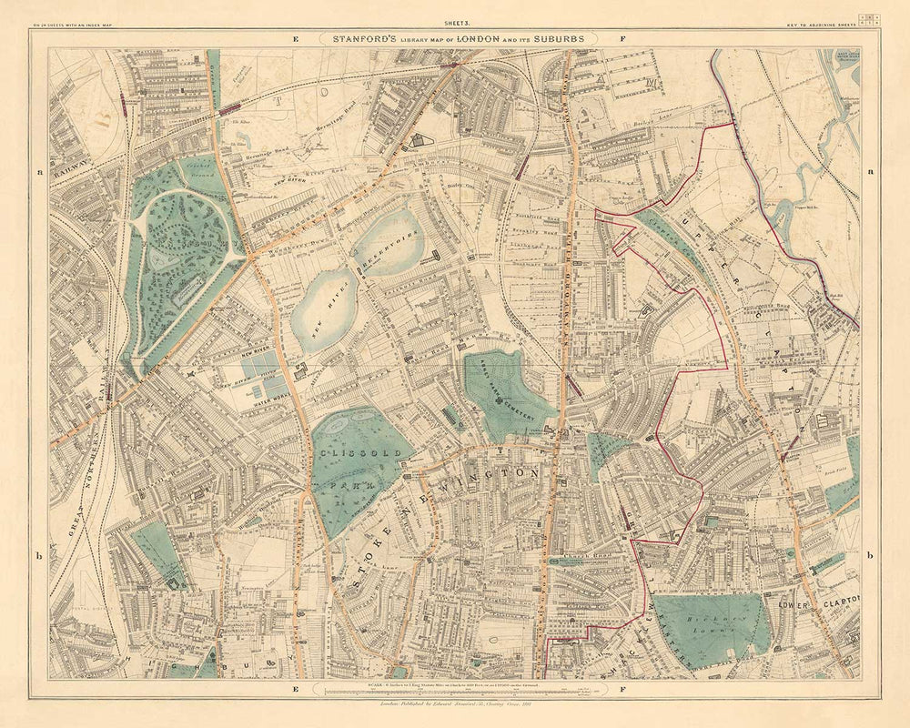 The map was originally published in 24 sheets. Altogether the map would've measured about 2 metres wide (78 inches). This here is sheet 3, which focuses on Stoke Newington, Hackney Downs, Finsbury Park and other nearby areas.