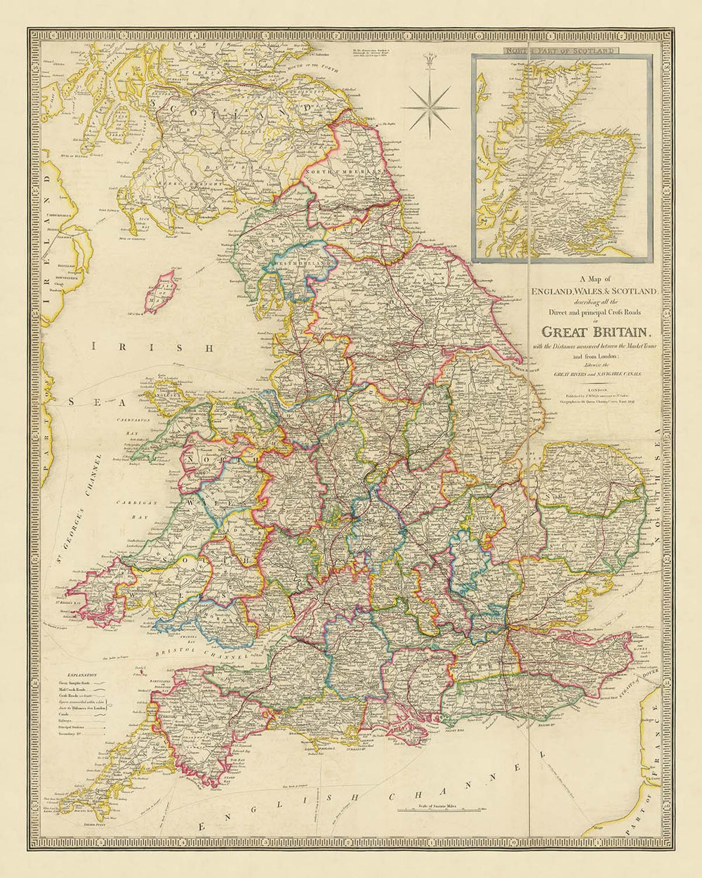 - Covers England, Wales, and much of Scotland, with county boundaries clearly delineated