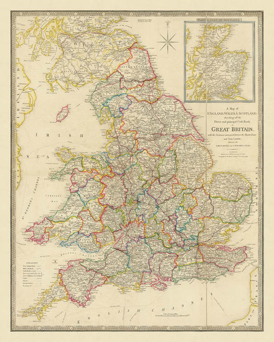 Step into the intricate world of Victorian cartography with James Wyld’s masterwork, “A Map of England, Wales & Scotland, Describing all the Direct and principal Cross Roads in Great Britain, with Distances measured between Market Towns from London: Likewise the Great Rivers and Navigable Canals.” Crafted in 1842, this map is more than a geographic document—it is a window into the heartbeat of 19th-century Britain, where burgeoning industry and innovation were reshaping the land. Wyld’s meticulous attention to detail reveals a nation on the cusp of modernity, with every county boundary, river, and route carefully inscribed to guide travelers and merchants alike through the vibrant tapestry of Great Britain.
