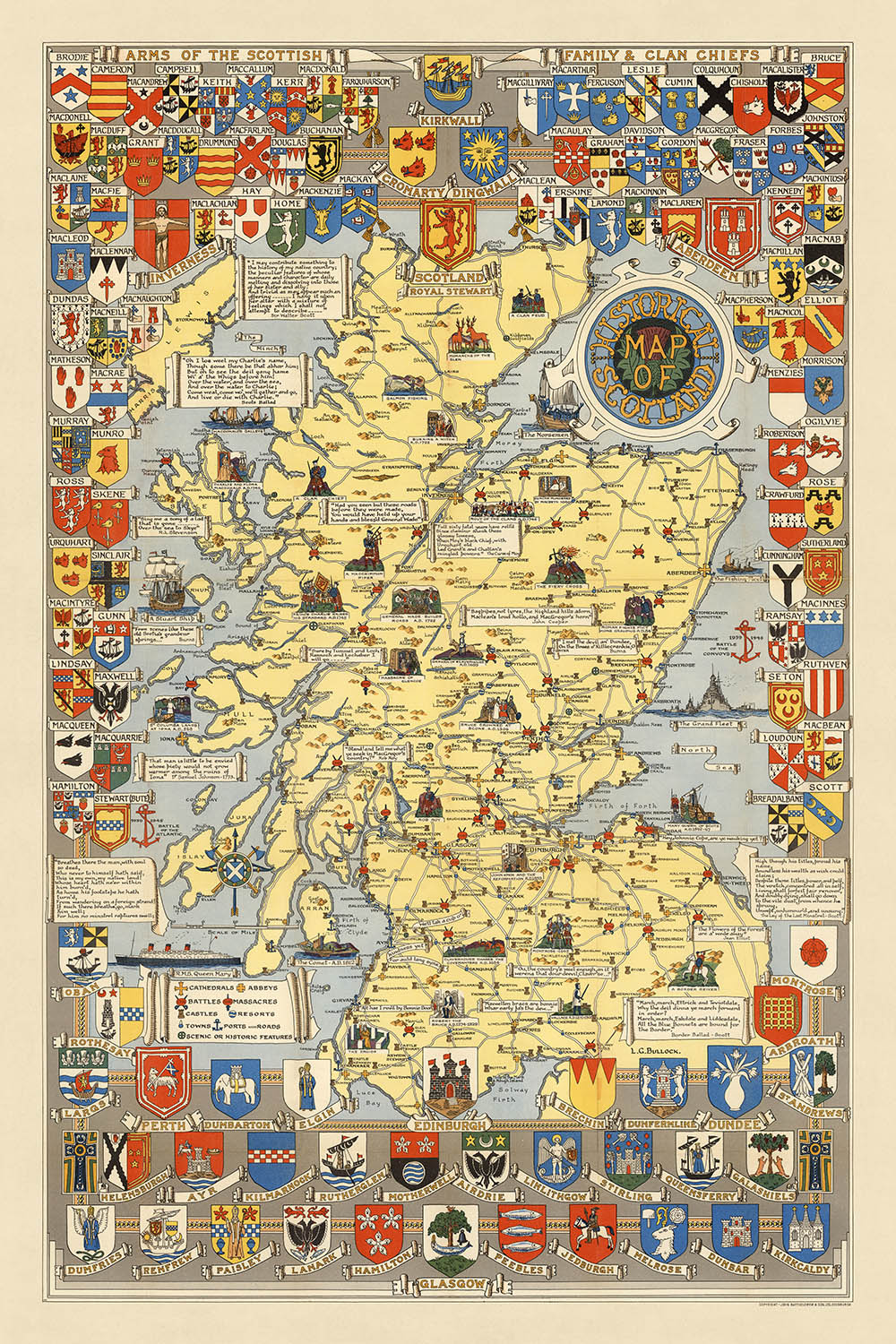 Old Historical Map of Scotland by Bullock, 1950: Clans, Tartans, Battles, Castles, Wildlife, Coats of Arms