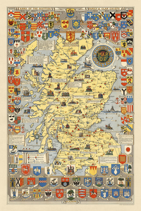 In essence, the "Historical Map of Scotland" by LG Bullock is a masterpiece that transcends the conventional boundaries of cartography. It is a celebration of Scotland's rich heritage, a visual compendium of its history, culture, and natural beauty. For historians, cartography enthusiasts, and anyone fascinated by Scotland, this map offers an unparalleled exploration of the country's past, presented through the lens of one of Britain's most skilled mapmakers. As a luxury item, it represents a unique opportunity to own a piece of history, meticulously rendered with an eye for detail and a deep appreciation for the stories that have shaped the land and its people.