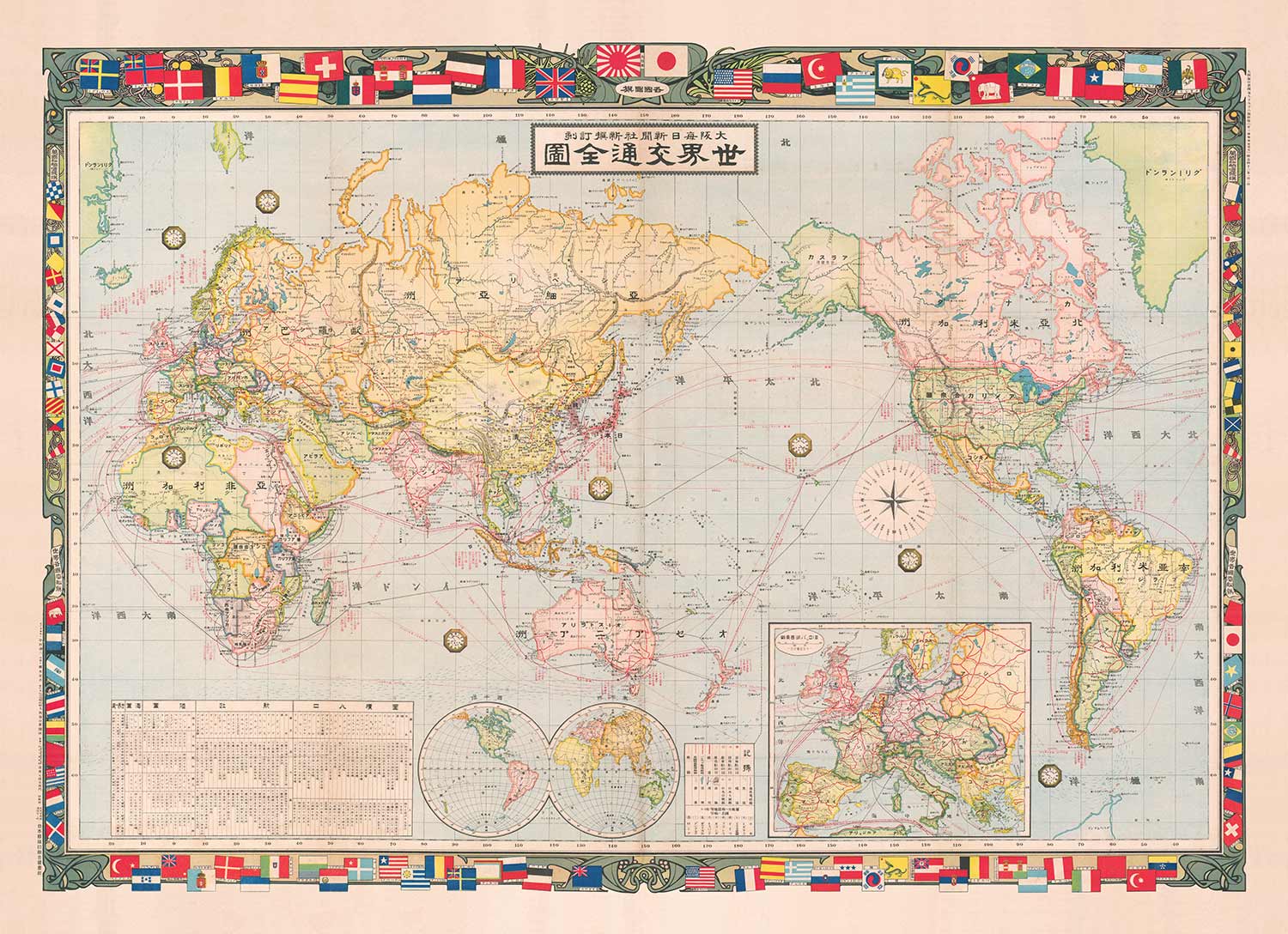 There is a lot of detail on this map, including international shipping lanes and both national/transcontinental railway lines. Dotted around the edge of the map are the flags of most major nations in the world.