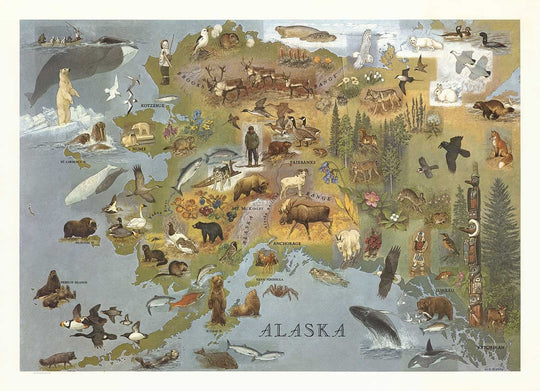 This isn't so much a map that would help you get back to civilisation if you were lost in Alaska... but rather a very attractive map showing you lots of the animals and Eskimos native to Alaska.