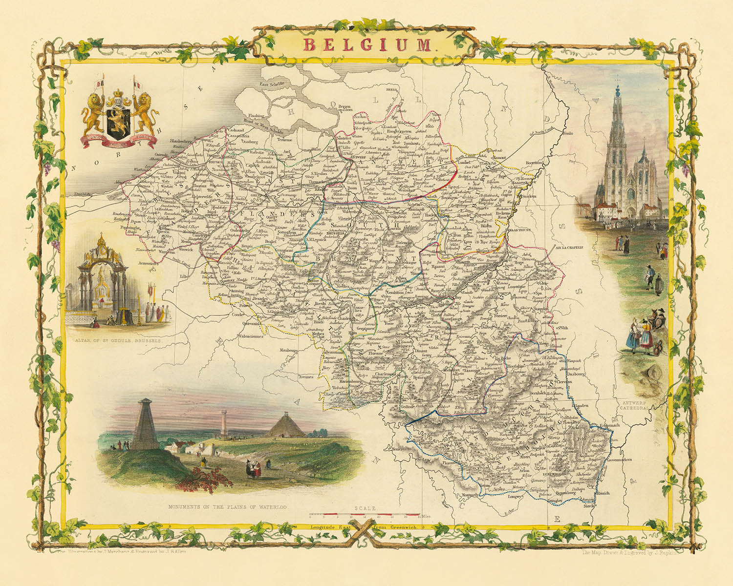 Perhaps most captivating are the hand-colored vignettes that grace the map’s margins, each capturing a moment or monument of national significance. The Altar of St. Gudule in Brussels, the soaring spires of Antwerp Cathedral, and the solemn Monuments on the Plains of Waterloo are all depicted in delicate pastels. These illustrations serve as windows into Belgium’s spiritual, architectural, and military heritage, offering a visual narrative that complements the map’s geographic detail. Such embellishments are hallmarks of Tallis’s artistry, elevating the map from a navigational tool to a cultural artifact.
