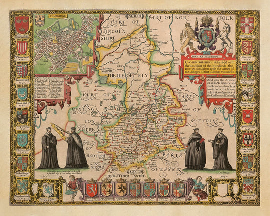 The zoomed-in map of Cambridge shows some of the university colleges that already existed in 1611, such as Trinity College, Kings College, Corpus Christi, Magdalene, Queens, Clare Hall, Christ's College and Peterhouse (then called St Peters House). The coats of arms for 15 colleges adorn the left and right side of the map. Really, it's all rather beautiful.
