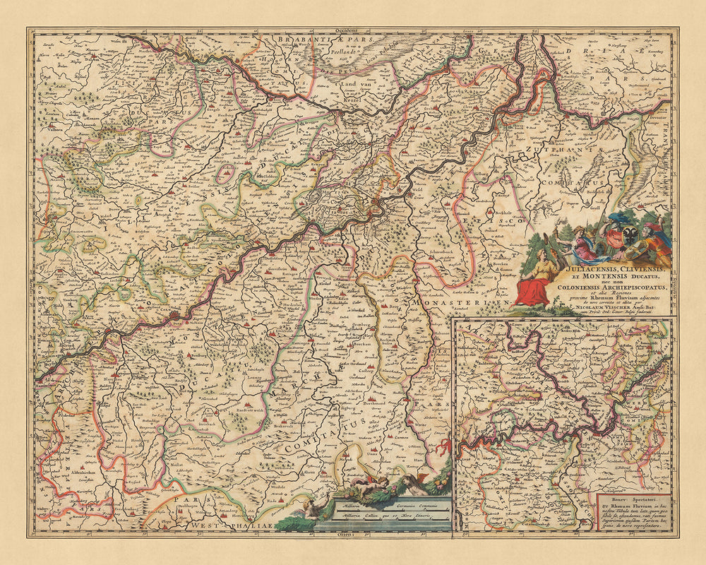Old Map of Duchies of Jülich, Cleves & Berg by Visscher, 1690: Düsseldorf, Essen, Cologne, Bonn, Dortmund