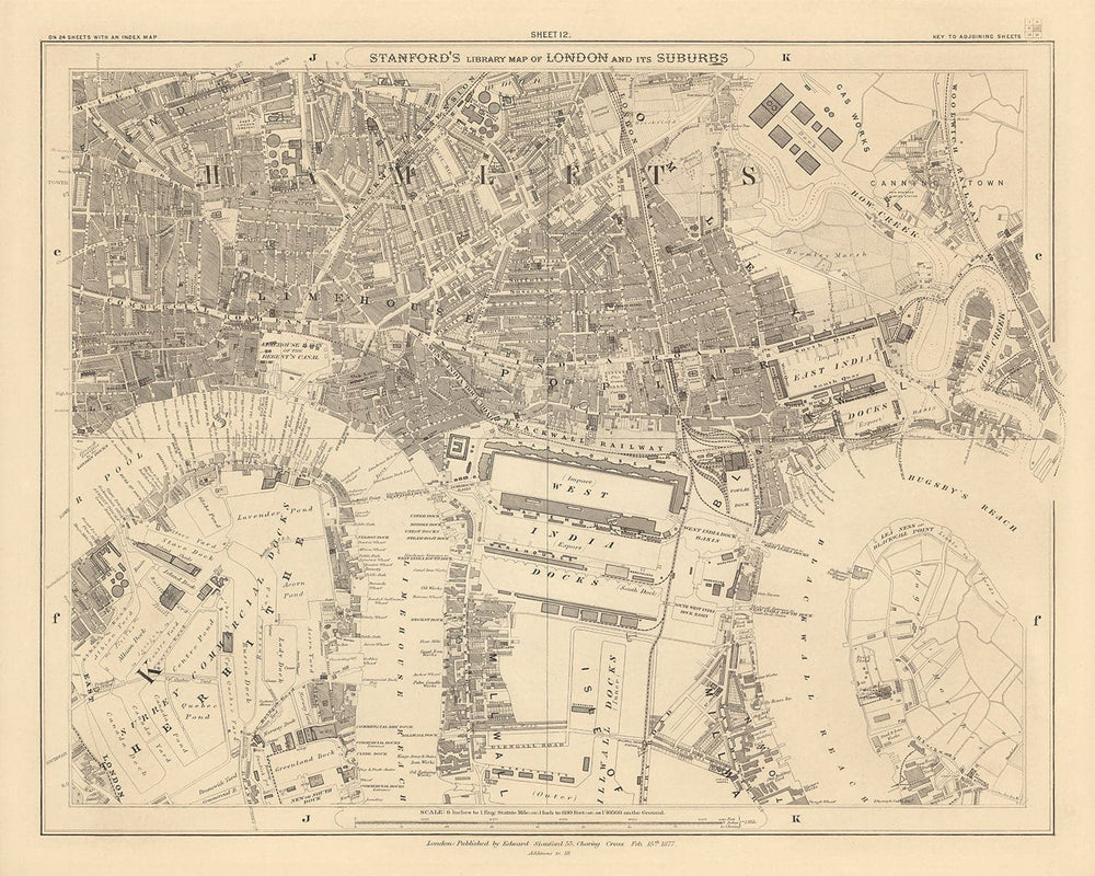 The map was originally published in 24 sheets. Altogether the map would've measured about 2 metres wide (78 inches). This here is sheet 12, which focuses on east and southeast London areas of Tower Hamlets, Limehouse, Poplar, Bow, Isle of Dogs, Surrey Quays and Rotherhithe - with a bit of Greenwich in the bottom right corner (where the O2 is today!)