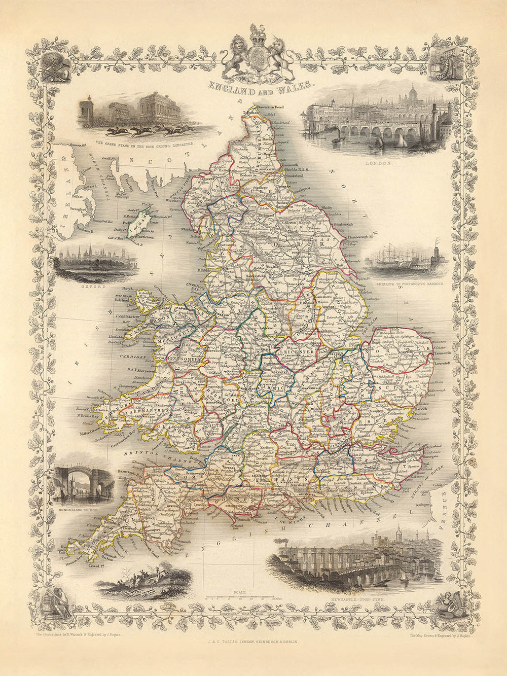 Step into the rich tapestry of mid-19th century England and Wales with this exquisite map titled "England and Wales," crafted by the renowned cartographers Tallis & Rapkin in 1851. This map is a testament to the meticulous artistry and detailed craftsmanship that defined the Victorian era of cartography. The map is not just a geographical representation but a visual feast, adorned with intricate illustrations and vignettes that bring to life the bustling cities, serene harbors, and verdant countryside of the time.