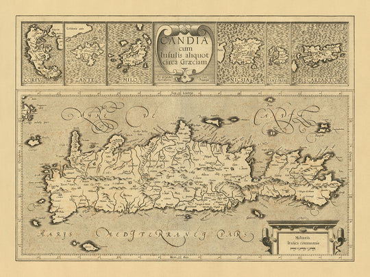 Gerhard Mercator, celebrated for his revolutionary Mercator projection, brings his expertise to bear in this stunning depiction of Crete. His work is not merely a geographical representation but a historical document that reflects the political and cultural landscape of the time. The map includes inset maps of Corfu, Zante, Milo, Nicsia, Santorini, and Scarpanto, each rendered with the same precision and care, providing a comprehensive view of the region's islands.