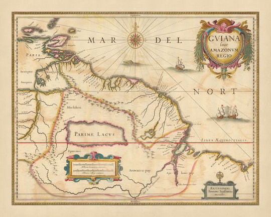 The map features several cities and landmarks that are of historical and geographical importance. These include Trinidad and Tobago, Suriname, Amapá, Pará, and Guyana. The map's extensive detailing allows the viewer to discern the different regions and political divisions of the time. It provides a unique perspective on the world as it was known in the 17th century, making it a fascinating piece for history enthusiasts and collectors alike.