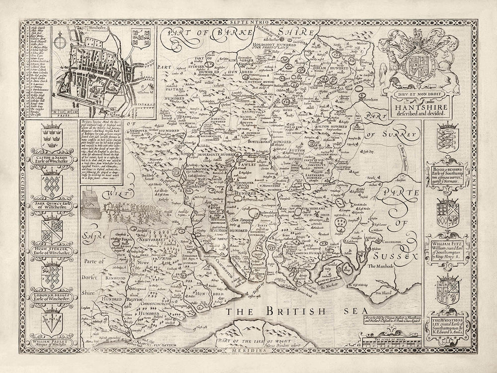 Many of the towns, villages and cities in Hampshire are already visible in this map. In the top left corner is a detailed engraving of Winchester, then (and still) the capital of this ancient county.