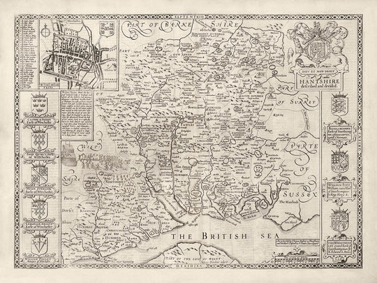 Old Map of Hampshire, 1611 by John Speed: Winchester, Portsmouth, Southampton, Basingstoke