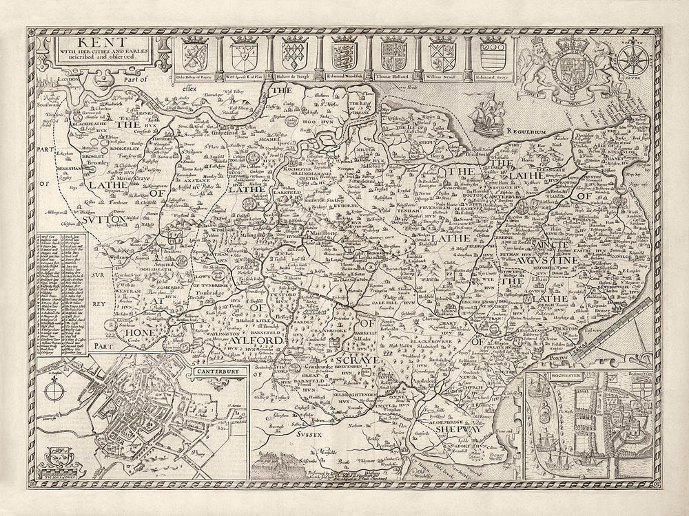 Old Map of Kent, 1611 by John Speed: Canterbury, Maidstone, Bromley, Tunbridge, Margate