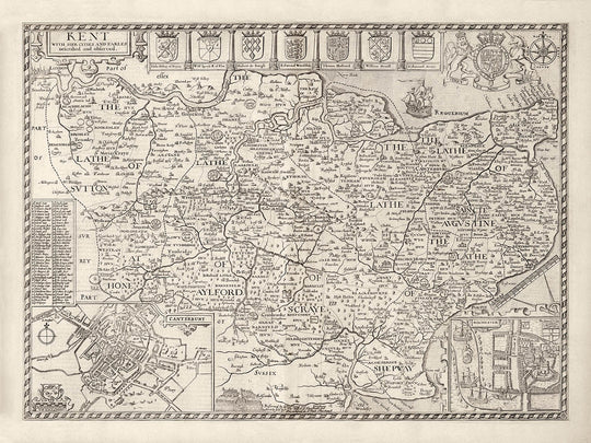 This old, monochrome and wonderful map shows the ancient county of Kent as it was in 1611. It was created by John Speed and engraved by Jodocus Hondius, and originally published in Speed's "The Theatre of the Empire of Great Britaine".