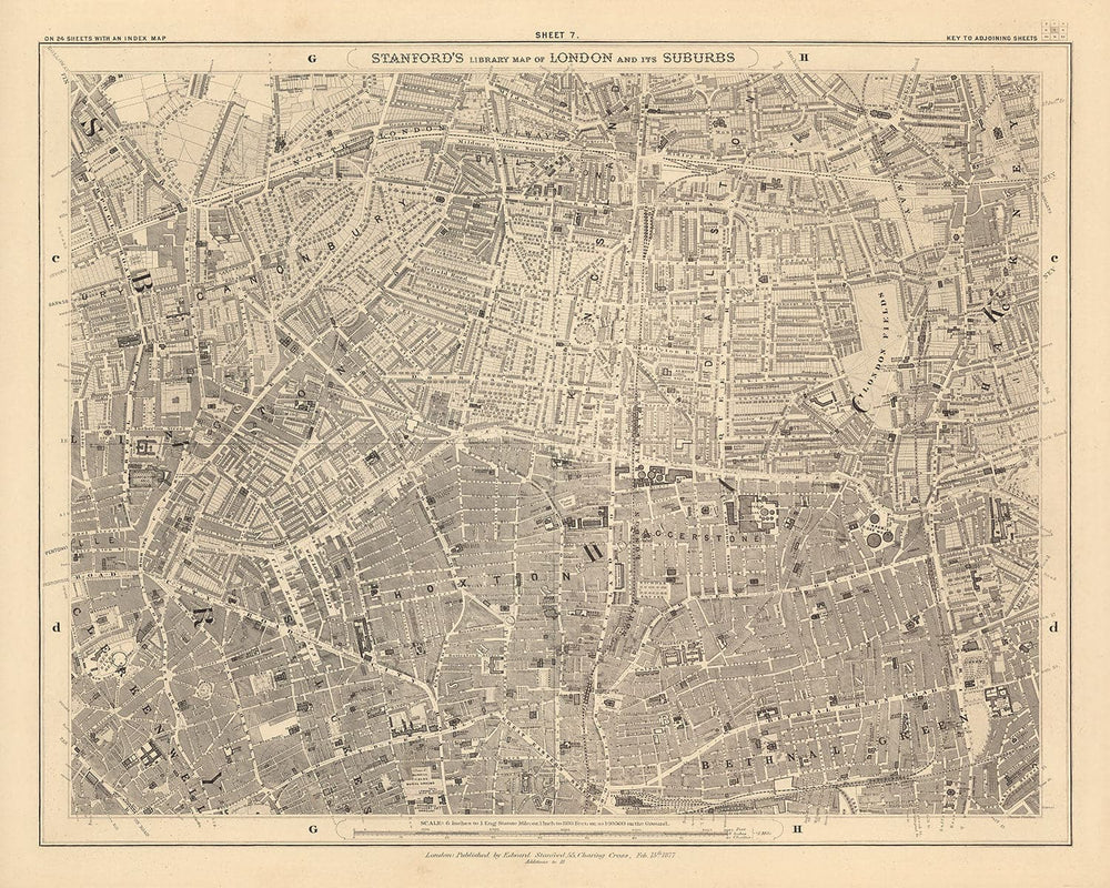The map was originally published in 24 sheets. Altogether the map would've measured about 2 metres wide (78 inches). This here is sheet 7, which focuses on the city centre parts of the modern day boroughs of Islington and Hackney.