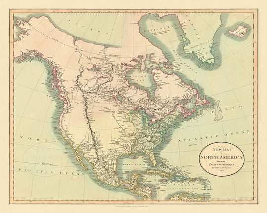 Finally, "A New Map of North America From The Latest Authorities" is not only a historical artifact but also a work of art. Hand-colored and engraved with a decorative border, it exemplifies the craftsmanship of early 19th-century mapmaking. The inclusion of a table of distances and the careful attention to design elements make this map a valuable item for collectors and enthusiasts alike. John Cary's map is a bridge between the known and the unknown, a document that captures the spirit of exploration and the endless possibilities that lay beyond the frontier. It invites us to explore, to dream, and to marvel at the world as it was known to our ancestors, on the eve of great discoveries.