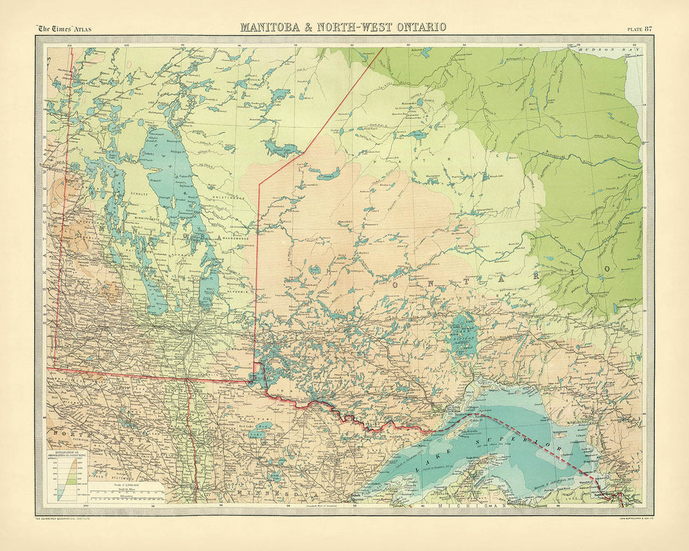 Step into the world of early twentieth-century cartography with "Manitoba & North-west Ontario," a masterwork crafted in 1922 by the eminent Scottish mapmaker J G John George Bartholomew. Bearing its original title, this map is a distinguished example of Bartholomew’s transformative influence on mapmaking, created for the prestigious Times Atlas & Gazetteer of the World. This edition marked a pivotal moment, as Bartholomew’s detailed and visually sophisticated style replaced the earlier Andree maps, ushering in a new era of accuracy and elegance for one of the world’s most respected atlas series.