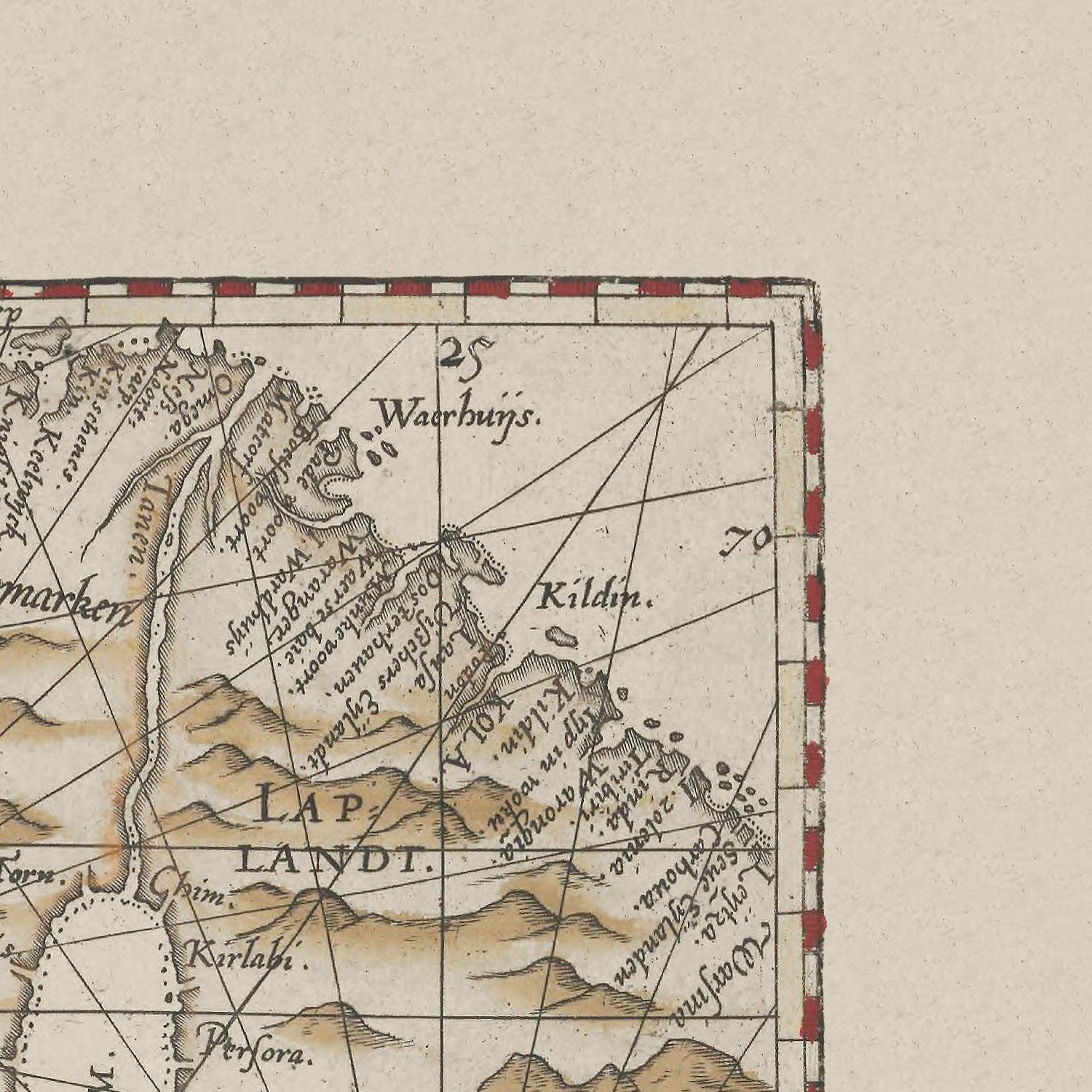 Visually, the sheet is a pageant of late-Renaissance cartography in full sail. Multi-point compass roses bloom across the seas, their petals linked by taut rhumb lines; stylized mountain chains and finely hatched coastlines delineate the lands beyond the tide. Heraldic coats of arms—Spain, Portugal, France, the Netherlands, England, Sweden, Norway—punctuate the political seascape, while bustling galleons and spirited sea monsters animate the waters with the era’s bravado and anxieties. Doetecum’s incisive burin yields crisp lettering and sumptuous ornament, a decorative vocabulary that complements the chart’s instrumental purpose. Rich color heightens the hierarchy of coasts, kingdoms, and currents, making the map at once a working guide and a masterwork of maritime pageantry.