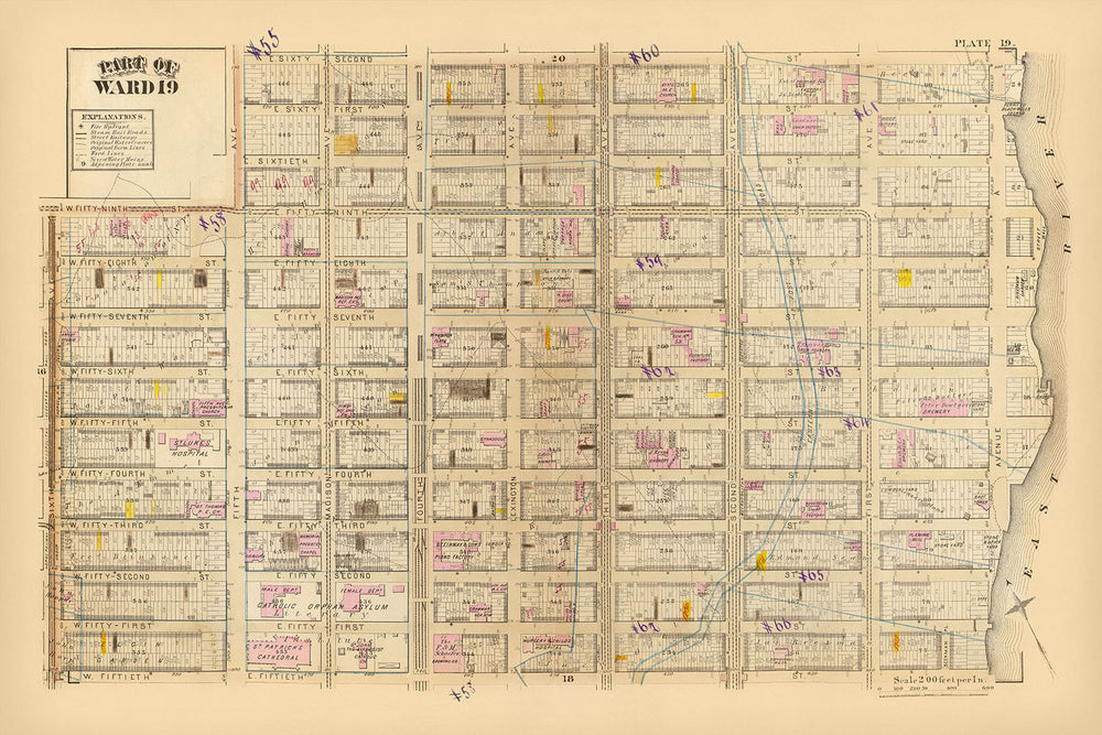 Old Map of Midtown East, NYC, 1879: St. Luke's Hospital, St. Patrick's Cathedral, Steinway & Sons Piano Factory, Ward 19