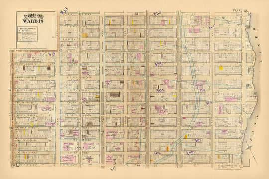 This exquisite 1879 map showcases a detailed portion of Ward 19 in New York City, hand-colored and lithographed by the notable G.W. Bromley. A cartographic artifact of immense value, it meticulously documents the urban landscape of the late 19th century, including buildings, fire hydrants, and even water mains. The map goes beyond mere geography, serving as a historical record of New York's development during this era.