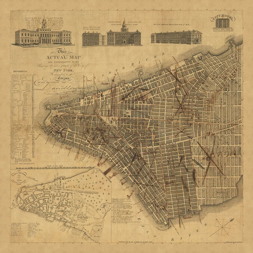 Longworth's map is adorned with vignettes of significant landmarks, such as City Hall, New York Hospital, and the City Hotel, showcasing the architectural achievements of the time. These illustrations not only enhance the map's aesthetic appeal but also serve as historical markers of New York's cultural and civic milestones. The map's inset of the James Lyne plan of 1729 further enriches its historical value, offering a comparative view of the city's growth over nearly a century.