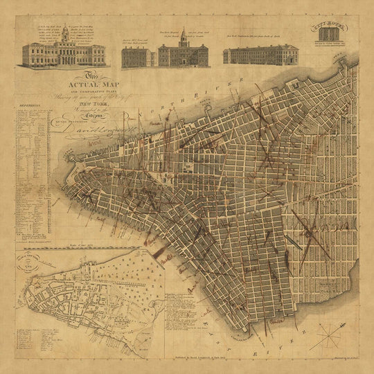 "This Actual Map and Comparative Plans Showing 88 years growth of the City of New York," crafted by the esteemed David Longworth in 1817, offers a captivating glimpse into the early 19th-century evolution of Lower Manhattan. This remarkable map not only charts the intricate street-by-street layout of the city but also captures the dynamic transition from farmland to urban sprawl. As a rare and detailed depiction of New York City, it reflects the burgeoning metropolis's growth and development, making it a treasure for historians and collectors alike.