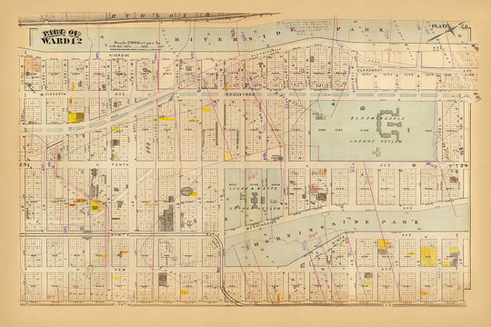 "Part of ward 12, New York City," a captivating hand-colored lithograph created by G.W. Bromley in 1879, offers a detailed glimpse into the urban fabric of New York City during the late 19th century. This exquisite map showcases the intricate layout of Morningside Heights, a neighborhood renowned for its rich history and architectural splendor. The meticulous detailing of buildings, ward boundaries, and original farm lines provides a fascinating insight into the development patterns of this iconic area, making it a valuable artifact for both historians and enthusiasts of urban evolution.