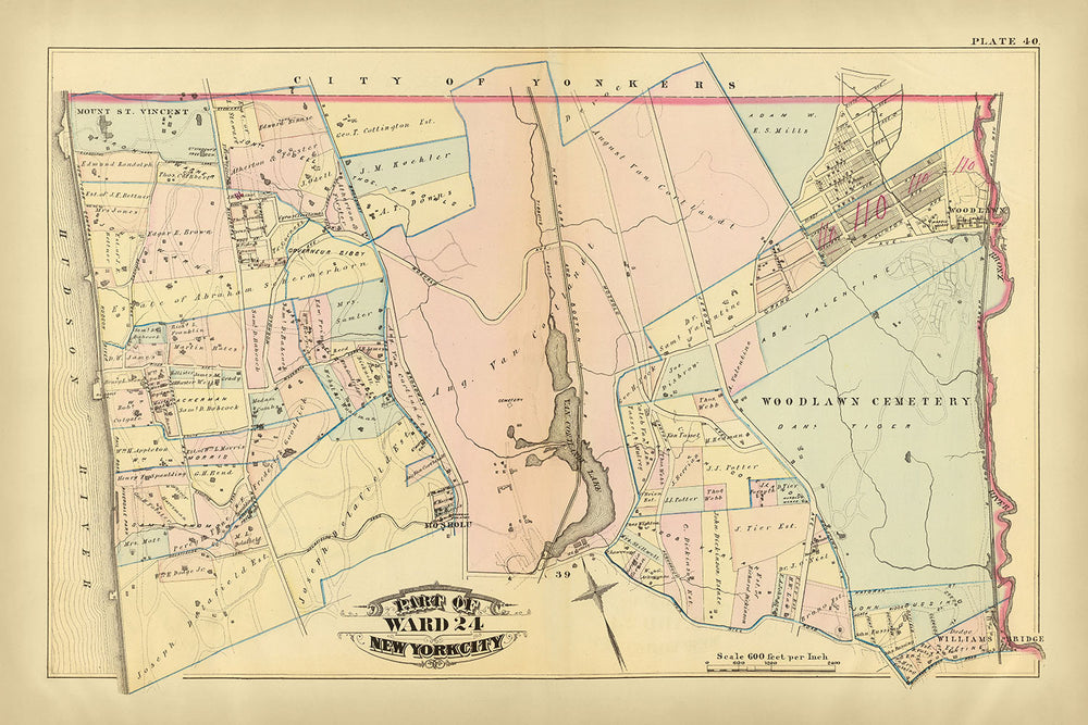 Rivers and watercourses are also intricately detailed, with the map showing the original courses of these waterways before modern alterations. The presence of Van Cortlandt Lake and its surrounding areas is particularly noteworthy, as it provides a snapshot of the natural landscape that has since been integrated into the urban environment. This focus on natural features underscores the map's role in documenting the balance between urban development and natural preservation.