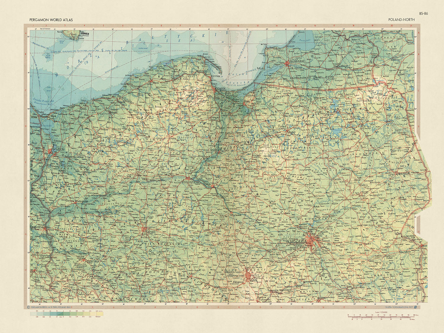 Poland North, published in 1967 by the Polish Army Topography Service, is a detailed political and physical map of the northern half of Poland and Kaliningrad. The map provides a wealth of information about the region, including its topography, hydrography, political boundaries, and major cities and towns.