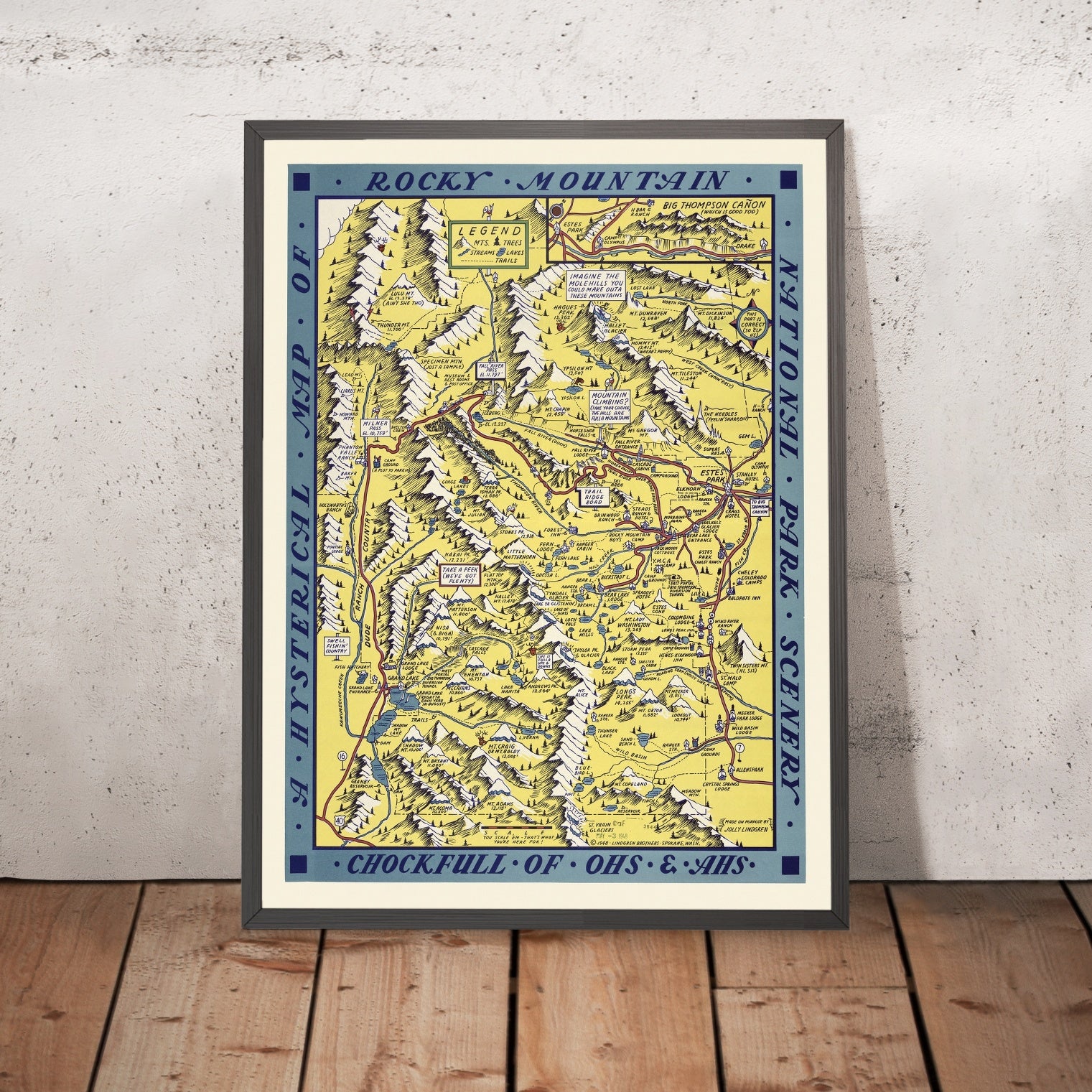 Rare Old Map of Rocky Mountain National Park by Lindgren, 1948: Trail Ridge Rd, Estes Park, Longs Pk, Bear Lake, Grand Lake