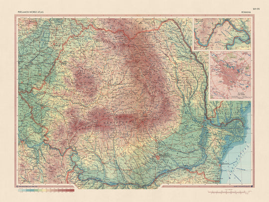 Old Map of Romania, 1967: Bucharest, Cluj-Napoca, Timișoara, Carpathian Mountains, Danube River