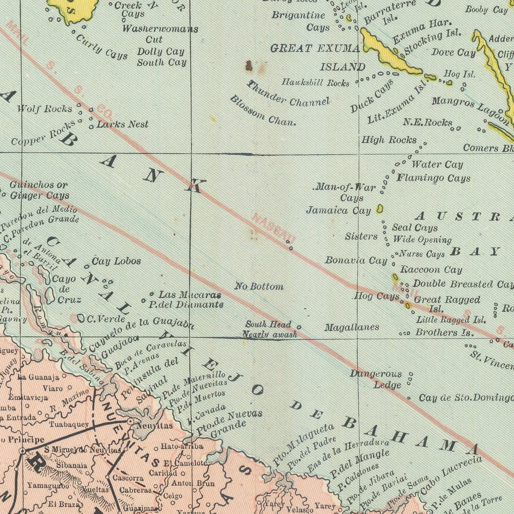 True to its atlas lineage, the map is animated by routes. Maritime lanes arc between Havana, Kingston, and the Gulf ports, their courses braided through the Straits of Florida and the Windward Passage, with navigational notations that speak to steamship era precision—waypoints, bearings, and carefully observed corridors. Overland, rail connections are registered where established, especially in Cuba’s corridors tying plantations to harbors, while principal roads echo older colonial itineraries. Southern Florida enters as the northern threshold: keys, banks, and shoals signal the delicate seam between peninsula and Caribbean. Together, these threads of movement reveal a logistics map of empire, trade, and modern travel.