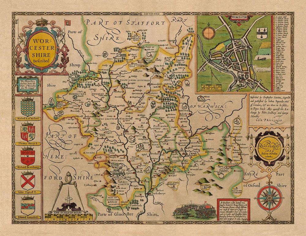 Old Map of Worcestershire in 1611 by John Speed: Worcester, Bromsgrove, Kidderminster, Malvern, Droitwich