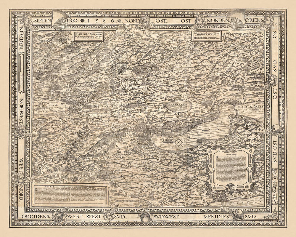 The "Eigentliche Verzeichnuss der Stätten, Graffschafften vnd Herrschafften, welche in der Statt Zürich Gebiet vnd Landscafft gehörig seind," created by the renowned cartographer Jodocus Murer in 1566, is a captivating window into the past. This exquisite bird's eye view pictorial map meticulously delineates the canton of Zurich, offering a monochrome masterpiece that is as much an artistic triumph as it is a historical document. Murer's work, framed by a decorative border featuring detailed windheads and skulls, exudes the Renaissance spirit, combining intricate artistry with precise geographical representation.