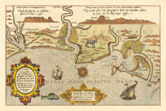 Old Naval Map of Cadiz by Waghenaer, 1583: Strait of Gibraltar, Cadiz, Lisbon, Sea Monsters, Sailing Ships