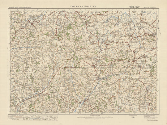 The "Sheet 129 - Chard & Axminster" is an authentic and fascinating old map from Ordnance Survey's One-inch "Popular" edition, England and Wales, published in 1925. This meticulously detailed map showcases the towns of Chard and Axminster, along with several other noteworthy settlements and features. It provides a captivating glimpse into the past, allowing you to explore the landscape, roads, and landmarks of this historic region.