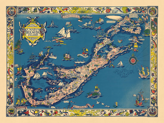 The map is adorned with humorous vignettes and a plethora of illustrations, including various types of ships, seaplanes, zeppelins, and even mythical sea monsters. These elements not only add a playful touch but also reflect the rich nautical heritage of Bermuda. The decorative border, filled with intricate patterns and illustrations, frames the map beautifully, making it a visual feast for the eyes. Shurtleff's attention to detail and artistic flair are evident in every corner of this map, making it a true masterpiece of early 20th-century cartography.