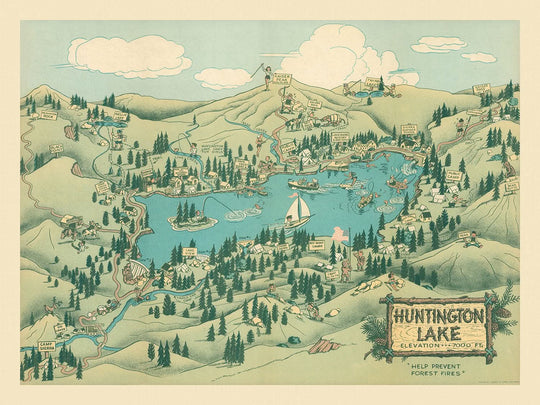 Lowell E. Jones, a celebrated San Diego-based mapmaker, is best known for his detailed pictorial maps of California during the 1930s and '40s. His work on Huntington Lake is a testament to his artistic prowess and keen eye for detail. This map is particularly significant due to its rarity, with no other known copies available online or in major collections. It offers a unique glimpse into the area's historical landscape, emphasizing the importance of forest conservation with its gentle reminder to "Help Prevent Forest Fires."