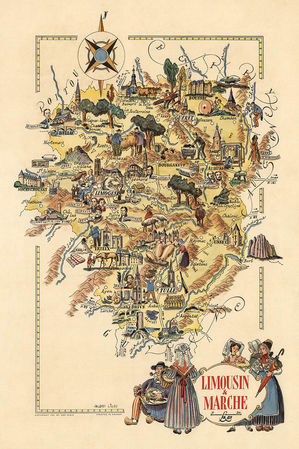 In addition to its geographical and historical richness, the "Limousin & Marche" map is a testament to Jacques Liozu's skill as a cartographer and artist. His ability to blend artistic elements with accurate geographical representation makes this map not only a functional piece but also a work of art. Whether for educational purposes, historical interest, or aesthetic appreciation, this map is a remarkable artifact that offers a window into the mid-20th century perception of Limousin and Marche.