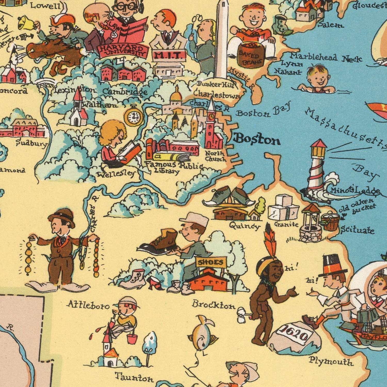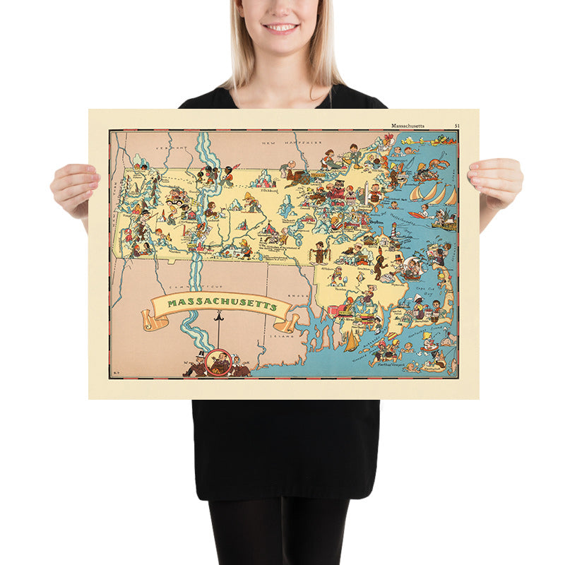 Pictorial Map of Massachusetts by Ruth Taylor White, 1935: Boston, Cape Cod, Harvard, Pilgrims, Maritime Heritage